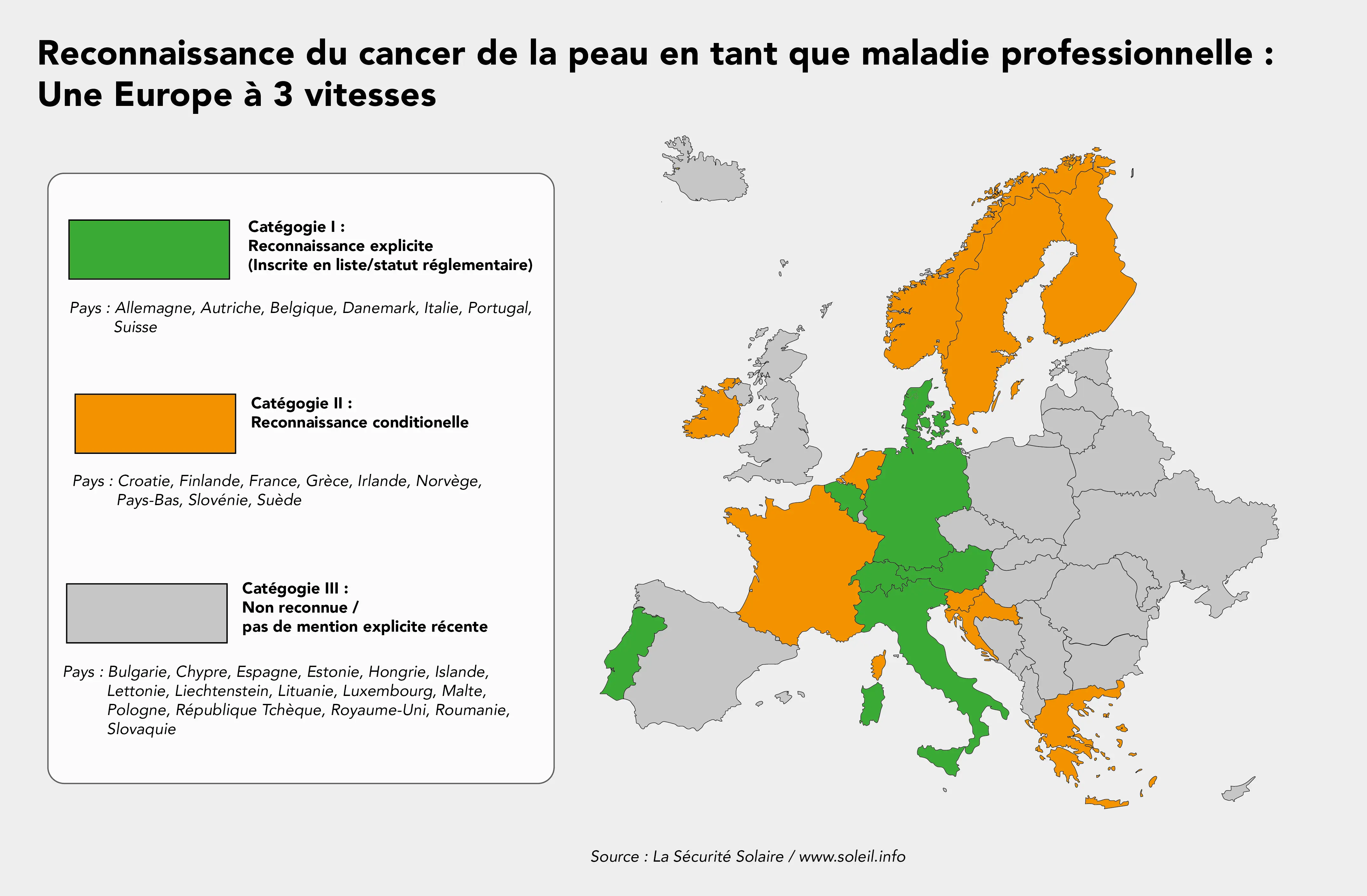 En matière de reconnaissance du cancer cutané en tant que maladie professionnelle existent des différences notables entre les pays européens.