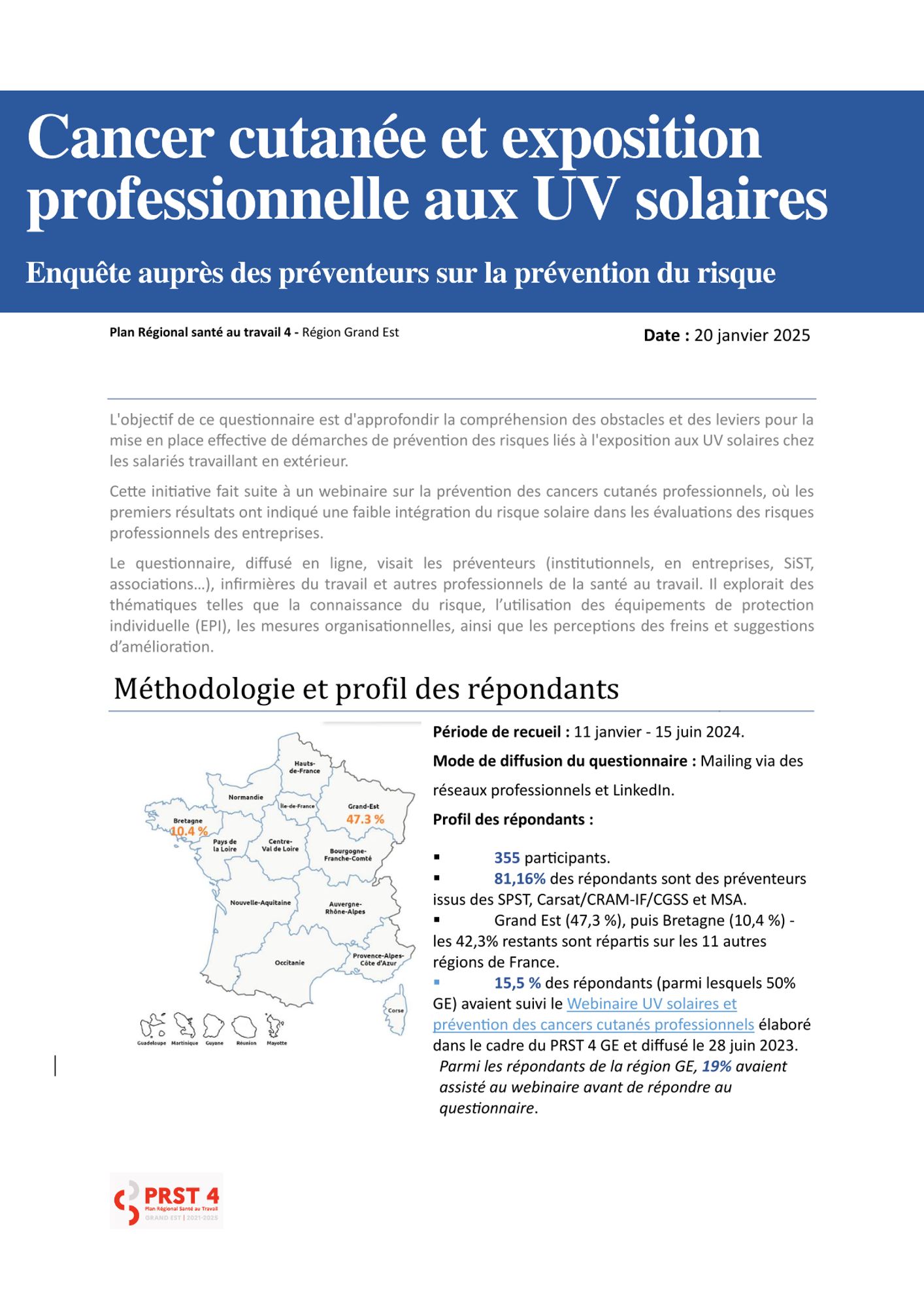 Vous ne le savez peut-être pas, mais une première enquête, réalisée au 1er trimestre 2024, sur la connaissance des risques liés à l’exposition aux UV solaires a rencontré un vif succès, avec plus de 1500 participations. Elle a été l’occasion de faire un point sur l’état des connaissances et des pratiques des professionnels de santé au travail et préventeurs. Vous en trouverez les résultats sur le site du PRST 4 Grand Est :